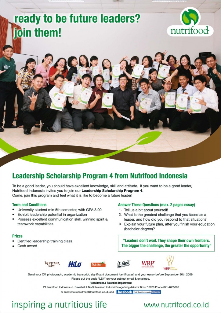 To be a good leader, you should have excellent knowledge, skill and attitude. If you want to be a good leader, Nutrifood Indonesia invites you to join our Leadership Scholarship Program 4. Come, join this program and feel what it is like to become a future leader!
