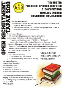 >Open Recruitment TAPAK 2010 5Mar 201017 May 2011Add a comment >Tim Asisten Pengantar Aplikasi Komputer & Ekonometrika FE UNPAD membuka kesempatan bagi teman-teman yang ingin menjadi Tim Asisten. Silahkan klik gambar untuk informasi lebih lanjut. Kandank Ilmu Team Share: Click to share on Facebook (Opens in new window) Facebook Click to share on X (Opens in new window) X Click to share on WhatsApp (Opens in new window) WhatsApp Click to share on Telegram (Opens in new window) Telegram Click to share on Reddit (Opens in new window) Reddit Click to share on Tumblr (Opens in new window) Tumblr Click to share on Pinterest (Opens in new window) Pinterest Click to share on Pocket (Opens in new window) Pocket Click to share on LinkedIn (Opens in new window) LinkedIn Click to email a link to a friend (Opens in new window) Email Click to print (Opens in new window) Print Like Loading... Related