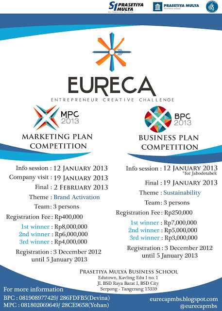 EURECA. A collective and integrated expo held by Prasetiya Mulya Business School undergraduate program, Eureca consists of several events which includes: Prasetiya Mulya’s prestigious annual Marketing Plan Competition, an annual Business Plan Competition, a public exhibition of start-up businesses called Entrepreneur Day, and a market research data exhibition called Marketing Attack Day. For the first time ever, these events who were once held separately, would now be held under the same event known as Eureca. WHERE and WHEN Prasetiya Mulya Business School Kampus BSD Kompleks Edutown Kavling 1 No. 1 Jalan BSD Raya Barat I, Tangerang Selatan, 15339 Saturday, 19th January 2013 09.30 AM – TBC