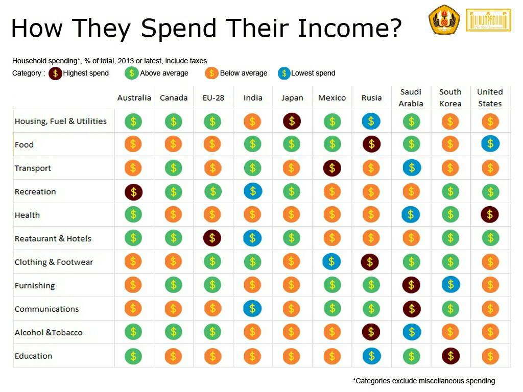 Perbandingan pengeluaran terkecil terjadi pada pengeluaran komunikasi di Negara India yang hanya sebesar 1.1 % dan pengeluaran pendidikan di Rusia yang juga hanya menghabiskan 1.1% dari totoal pendapatan