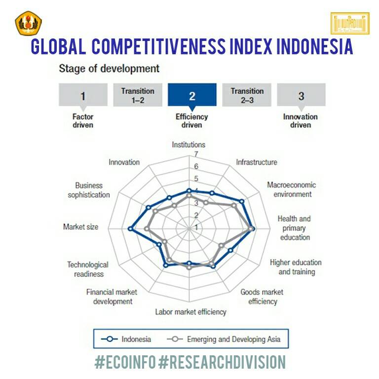 World Economic Forum (WEF) mendefinisikan daya saing sebagai kumpulan kelembagaan, kebijakan, dan faktor-faktor yang menentukan tingkat produktifitas suatu negara. Setiap tahun World Economic Forum menerbitkan laporan pemeringkatan negara dengan menggunakan indeks daya saing global atau Global Competitiveness Index (GCI) GCI merupakan ukuran daya saing setiap negara dengan menggunakan 126 indikator yang dikelompokkan ke dalam 12 pilar, yaitu kelembagaan, infrastruktur, lingkungan makro ekonomi, pendidikan dasar dan kesehatan, pendidikan tinggi dan pelatihan, efisiensi pasar barang, efisiensi pasar tenaga kerja, pengembangan pasar keuangan, kesiapan teknologi, ukuran pasar, kecanggihan bisnis, dan inovasi.