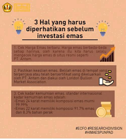 Emas adalah salah satu investasi yang menjanjikan untuk masa depan. Oleh karena itu, banyaknya masyarakat memilih investasi dalam bentuk emas pada saat sekarang, namun ada baiknnya kita mengetahui apa saja yg harus diperhatikan ketika akan investasi emas agar nantinya menguntungkan dan tidak merugikan.