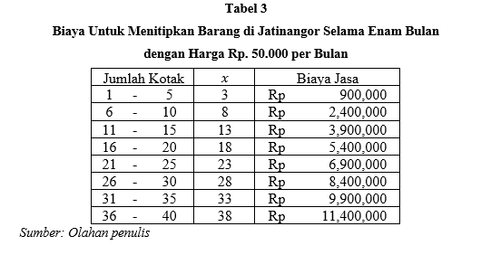 Data terakhir yang kami sesuaikan adalah biaya yang dikeluarkan untuk menitipkan barang menggunakan jasa penitipan di Jatinangor menggunakan kotak berukuran 50cm x 50cm x50cm dengan harga Rp. 50.000 per kotak dan per bulan. Dalam tabel 3 dibawah ini, nilai tengah dari julamh kotak yang dibutuhkan ditulis pada kolom, kemudian kolom biaya jasa merupakan data dari nilai tengah dikalikan dengan Rp. 50.000 sebagai biaya per kotak dan dikalikan 6 sebagai durasi penitipan selama enam bulan (Agustus 2020 – Januari 2021). Berikut adalah data selengkapnya.