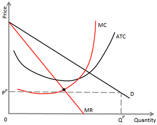 Gambar di atas menunjukkan tingkat harga yang mungkin diambil oleh pelaku predatory pricing, di mana tingkat keseimbangan berada pada titik di mana biaya marjinal (MC) berada di bawah biaya total rata-rata (ATC), dan kemudian barang atau jasa akan diproduksi pada jumlah yang diminta pada tingkat harga tersebut. Predatory pricing sering dipratikkan oleh pelaku usaha untuk bersaing dengan pelaku usaha lainnya, dimana produsen yang bisa bertahan lebih lama dengan harga paling murah akan keluar sebagai pemenangnya, dan menyebabkan produsen lainnya harus keluar dari pasar karena tak mampu bersaing. Karena, praktik ini sama saja dengan jual rugi, produsen yang bersangkutan harus memiliki modal yang besar untuk bertahan dalam skema ini, oleh karena itu, produsen yang biasa mempraktikkan skema ini adalah perusahaan-perusahaan besar yang cenderung memiliki market share yang besar.