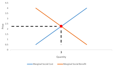 Dalam kasus masker sekali pakai ini, eksternalitas yang ditimbulkan tentunya membawa kerugian bagi pihak ketiga, di mana diperlukan biaya tambahan untuk menanggulanginya (internalization). Salah satu upaya internalisasi yang dapat dilakukan adalah dengan membebankan pajak kepada perusahaan produsen masker sekali pakai. Akibatnya, perusahaan akan memproduksi lebih sedikit sehingga harga yang dibebankan ke konsumen menjadi lebih tinggi. Seperti yang sudah disebutkan di atas, konsumen akan terus mengkonsumsi masker sekali pakai sampai dengan tingkat tambahan manfaatnya sama dengan tambahan biaya yang harus dikeluarkan untuk menginternalisasi dampak buruk yang dihasilkan. Untuk ilustrasi dari konsep tersebut bisa dilihat seperti dibawah ini.