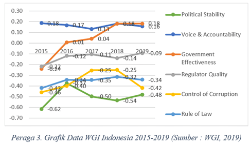 Kemudian dari sisi good governance yang menjadi pokok dari model “Governance”, kita dapat menilai dari enam indikator yang diterbitkan WGI (Worldwide Government Indicator), salah satu proyek dari World Bank. Hal ini dapat kita lihat dari Peraga 3, sepanjang 2016 – 2018, cenderung terjadi penurunan pada aspek: Political Stability, Voice & Accountability, dan Regulatory Quality, sedangkan sisanya terjadi kenaikan atau stagnan. Sedangkan Ketika memasuki 2019 Voice & Accountability, Rule of Law, dan Control of Corruption mengalami penurunan, utamanya pada Control of Corruption. Government Effectiveness di 2019 cenderung stagnan di 0,18. Terakhir di tahun 2019 Political Stability dan Regulator Quality cenderung menaik.