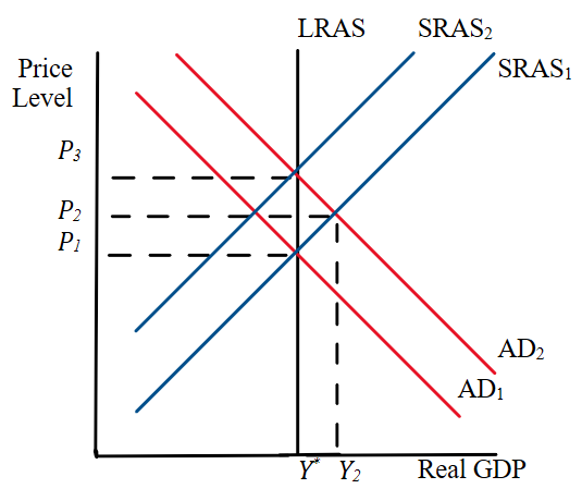 Dalam jangka panjang, ekspektasi harga dan upah akan menyesuaikan terhadap kenaikan harga yang terjadi. Pelaku usaha menuntut kenaikan upah untuk mengimbangi inflasi, dan hal tersebut menyebabkan biaya produksi naik. Akibatnya, penawaran agregat jangka pendek (SRAS) bergeser ke kiri, dari SRAS₁ ke SRAS₂. Output riil (Real GDP) perlahan turun kembali menuju output potensial (Y*), namun tingkat harga meningkat lebih lanjut menjadi P₃. Dengan kata lain, dampak jangka panjang dari kebijakan pemangkasan suku bunga ini adalah kenaikan harga yang berkelanjutan (inflasi), tanpa ada perubahan terhadap output riil (Real GDP) dalam jangka panjang.