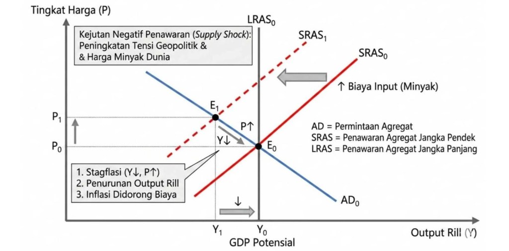 Secara teoritis, kondisi tersebut tercermin dalam pergeseran kurva short-run aggregate supply (SRAS) ke arah kiri. Pergeseran ini menunjukkan bahwa pada setiap tingkat harga, jumlah output yang dapat diproduksi menjadi lebih rendah dibandingkan sebelumnya. Akibatnya, perekonomian menghadapi kombinasi kenaikan tingkat harga dan penurunan output riil. Kondisi ini dikenal sebagai stagflasi, yaitu situasi ketika tekanan inflasi meningkat bersamaan dengan perlambatan aktivitas ekonomi.