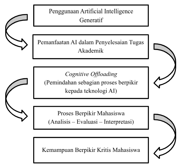 Penggunaan Artificial Intelligence generatif dalam proses pembelajaran juga berkaitan dengan konsep cognitive offloading, yaitu kecenderungan individu untuk memindahkan sebagian proses berpikir kepada alat atau teknologi eksternal. Dalam beberapa kondisi, penggunaan teknologi untuk membantu proses berpikir dapat meningkatkan efisiensi kognitif. Namun apabila digunakan secara berlebihan, cognitive offloading berpotensi mengurangi keterlibatan mental mahasiswa dalam proses analisis dan evaluasi informasi.